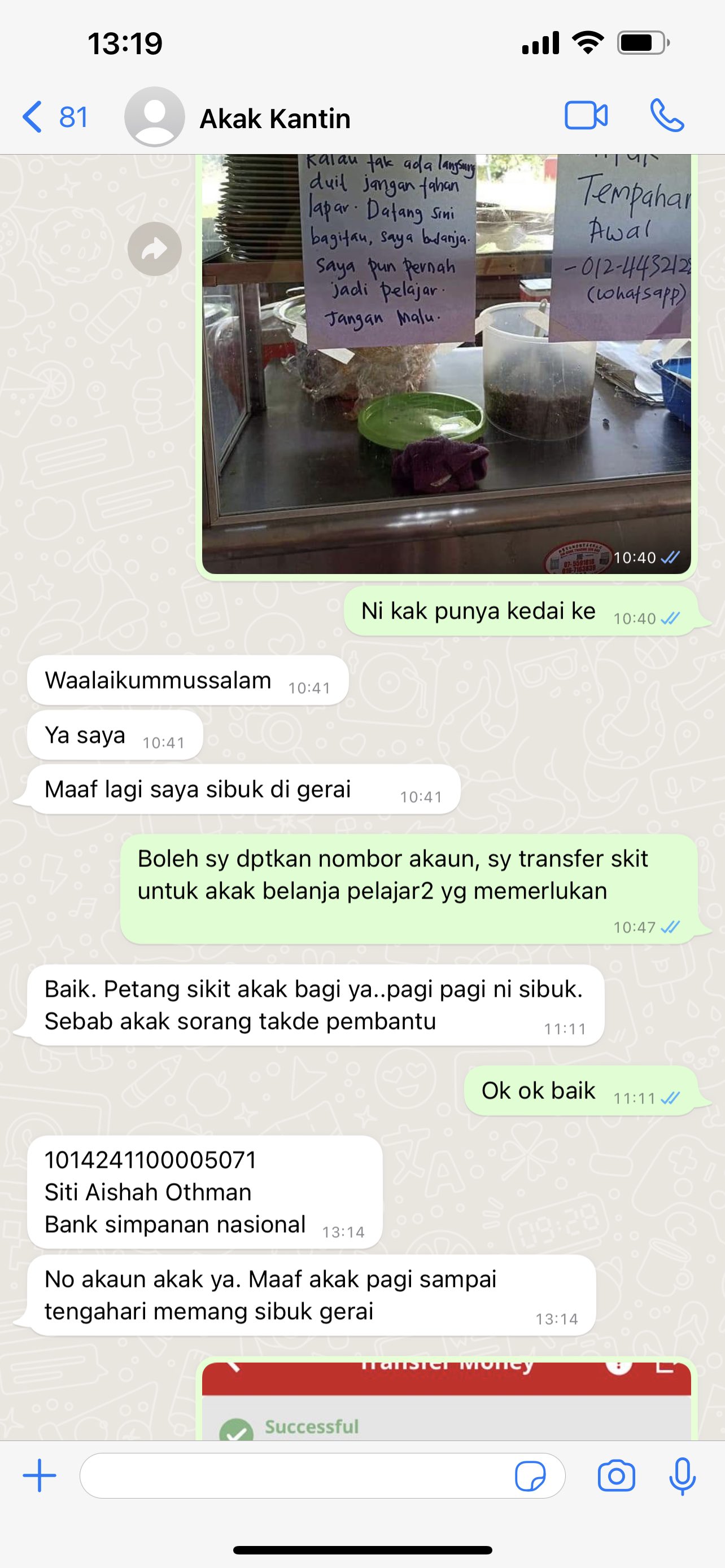 Ada juga pelajar yang datang tapi malu-malu hendak ambil saya faham kita orang susah memang pemalu tetapi saya ikhlas memberi kata anak kelapan daripada sembilan adik-beradik itu yang telah kematian ibu bapa.
